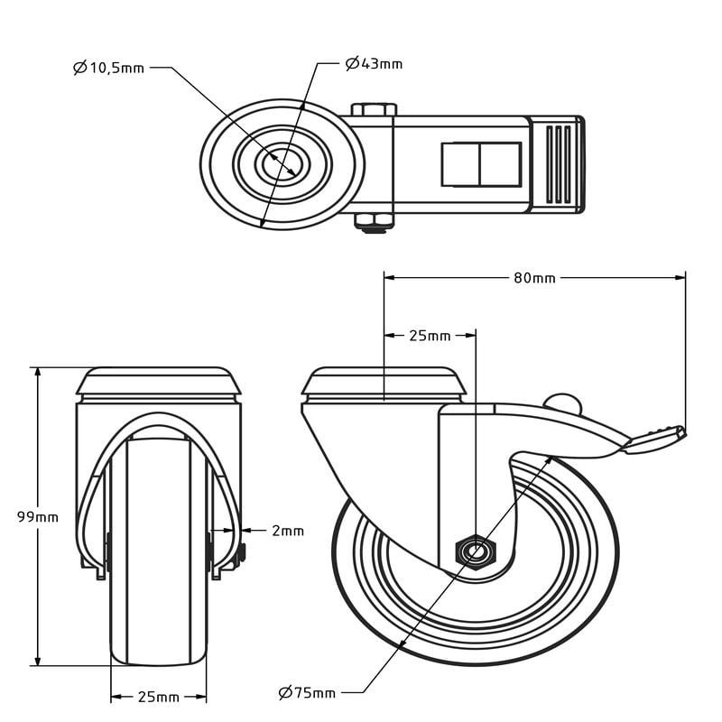 To czarne kółko obrotowe z hamulcem ma średnicę koła 75 mm i centralny otwór na śrubę 10,5 mm. Ułatwia to mocowanie do różnych podstaw, takich jak konstrukcje metalowe, stoły robocze lub ramy mebli. Mechanizm hamulcowy blokuje zarówno kóło, jak i funkcję obrotu, zapewniając dodatkową stabilność podczas postoju. Nadaje się do zastosowań o masie do 75 kg, m.in. w wyposażeniu sklepów i lekkich zastosowaniach przemysłowych.