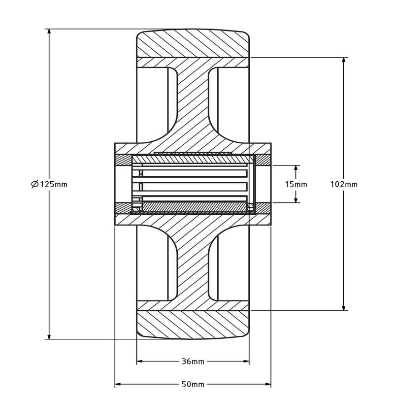 Kółko poliuretanowe 125 mm z łożyskiem wałeczkowym o średnicy 15 mm - 200 kg