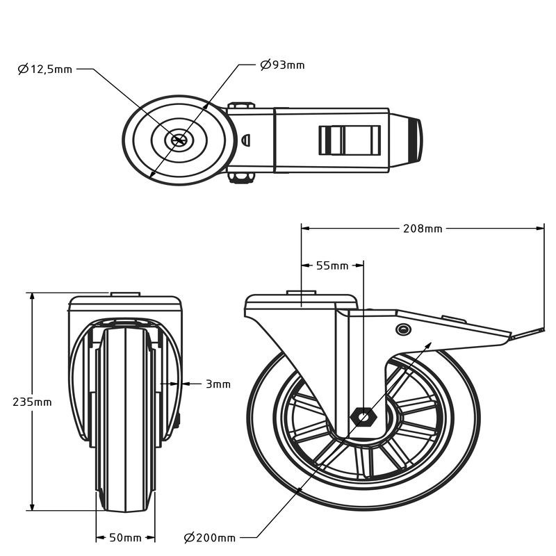 Elastyczne gumowe kółko obrotowe z hamulcem 200 mm z otworem na śrubę - 450 kg