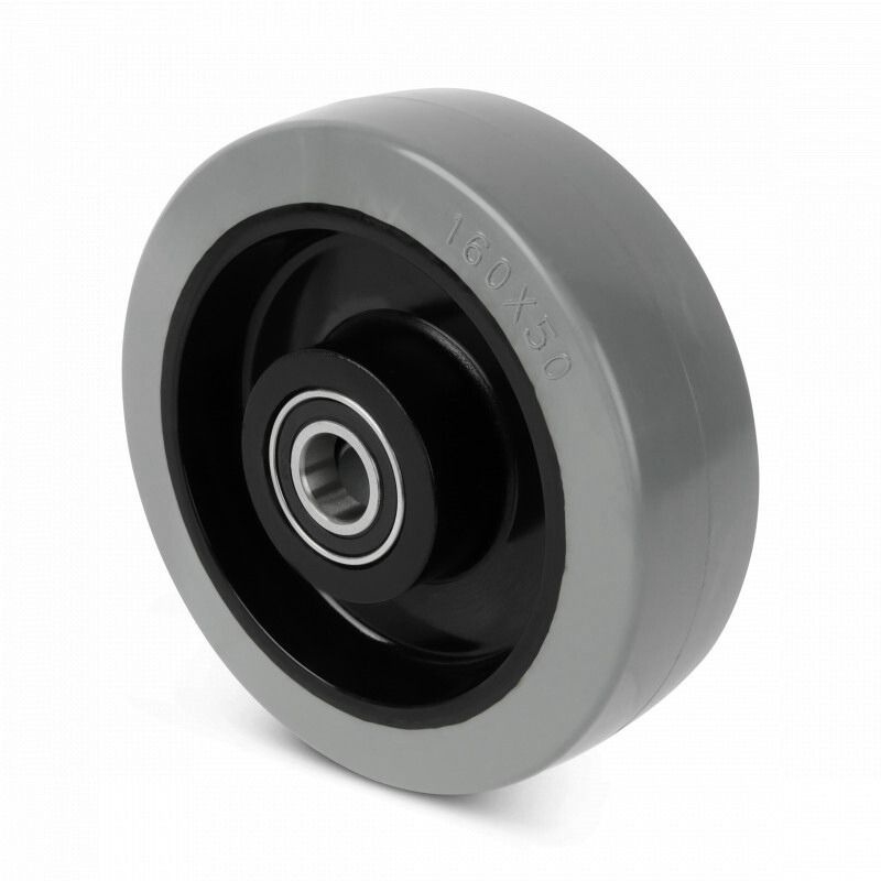 Kółka z szarą elastyczną oponą gumową (ok. 80 Shore A), wulkanizowaną na poliamidowej obręczy z łożyskami kulkowymi.