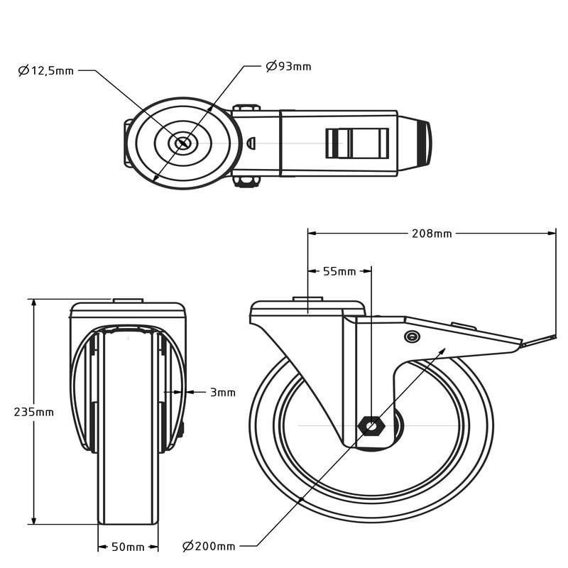 Gumowe kółko obrotowe z hamulcem 200 mm z otworem na śrubę - 400 kg