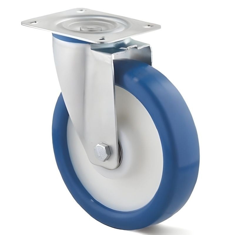 kóła met een niebieska opona poliuretanowa (98 Shore), wtryskiwana na felgę z poliamidu z podwójnymi łożyskami kulkowymi ze stali nierdzewnej.
