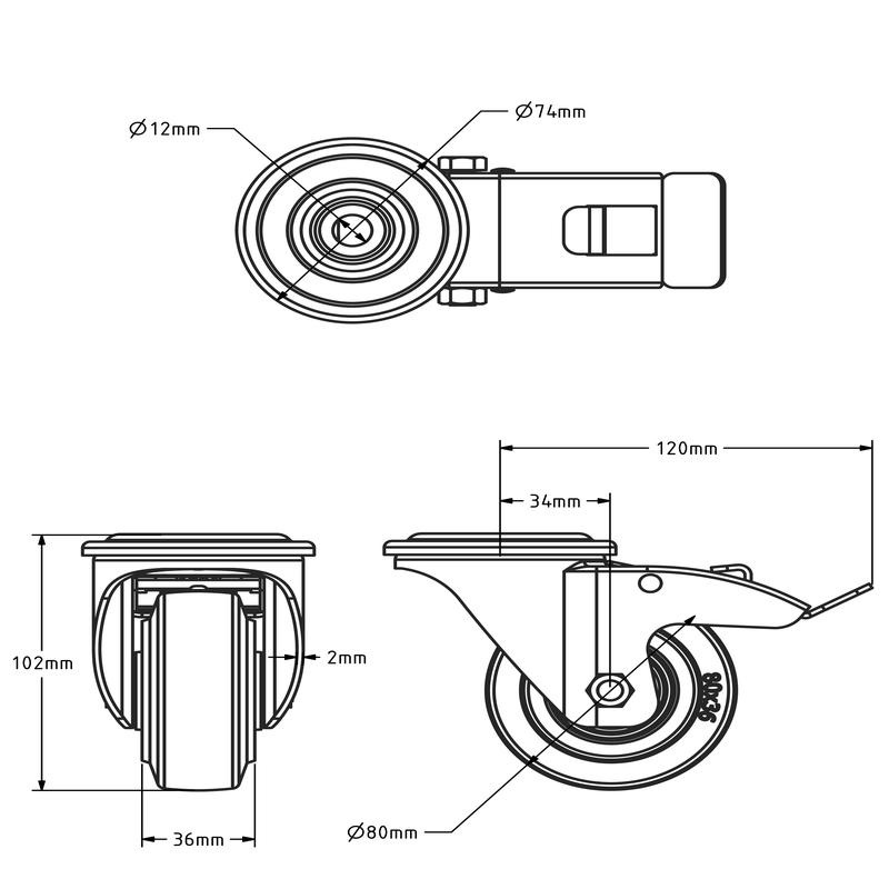 Kółka obrotowe ze stali nierdzewnej z hamulcem 80 - Elastyczna guma - 110 kg