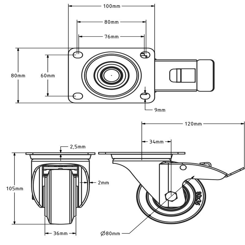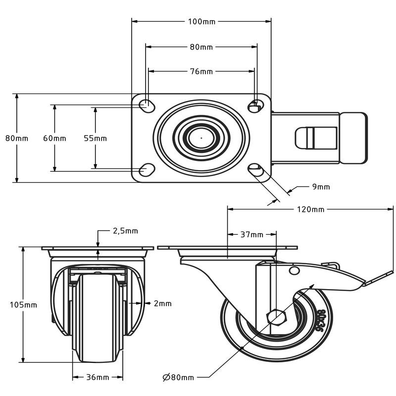 Kółka obrotowe ze stali nierdzewnej 80 z hamulcem - Elastyczna guma - 110 kg