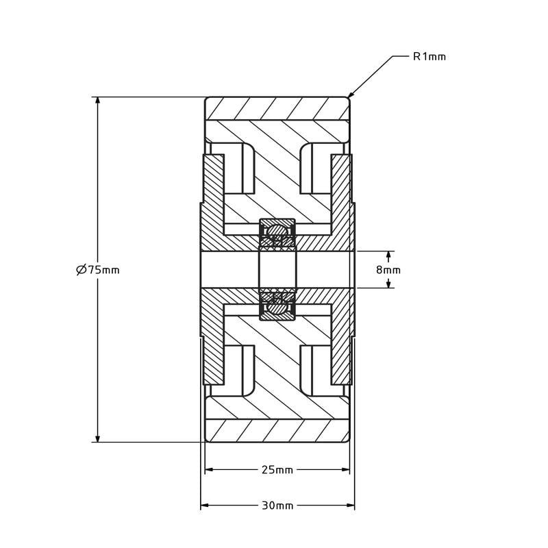 Kółko gumowe 75 mm - otwór łożyska kulkowego 8 mm - 75 kg