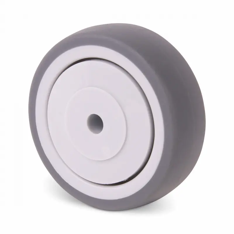 Kółka z szarą gumową oponą TPR (ok. 88 Shore A), wtryskiwaną na plastikową obręcz z łożyskami kulkowymi i szarymi plastikowymi osłonami kół.