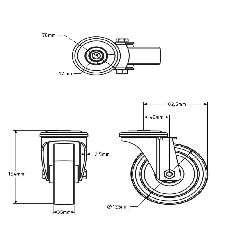 Kółko obrotowe ze stali nierdzewnej 125 mm PU z łożyskiem rolkowym ze stali nierdzewnej i mocowaniem z otworem na śrubę m12 - 200 kg