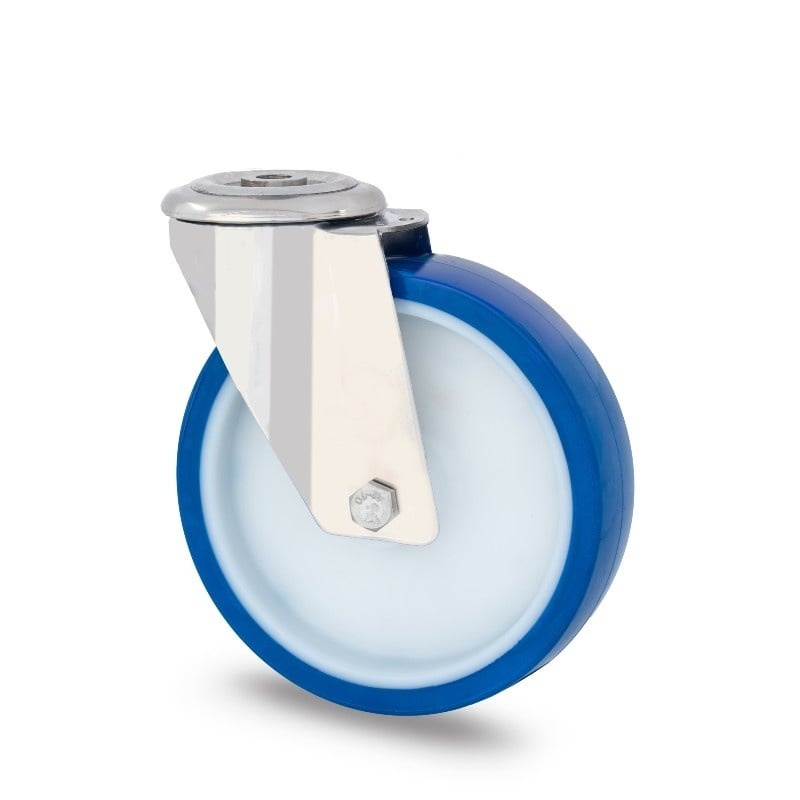 Kółka z niebieską oponą poliuretanową (95 Shore A) wtryskiwaną na białą obręcz poliamidową z łożyskiem rolkowym ze stali nierdzewnej.