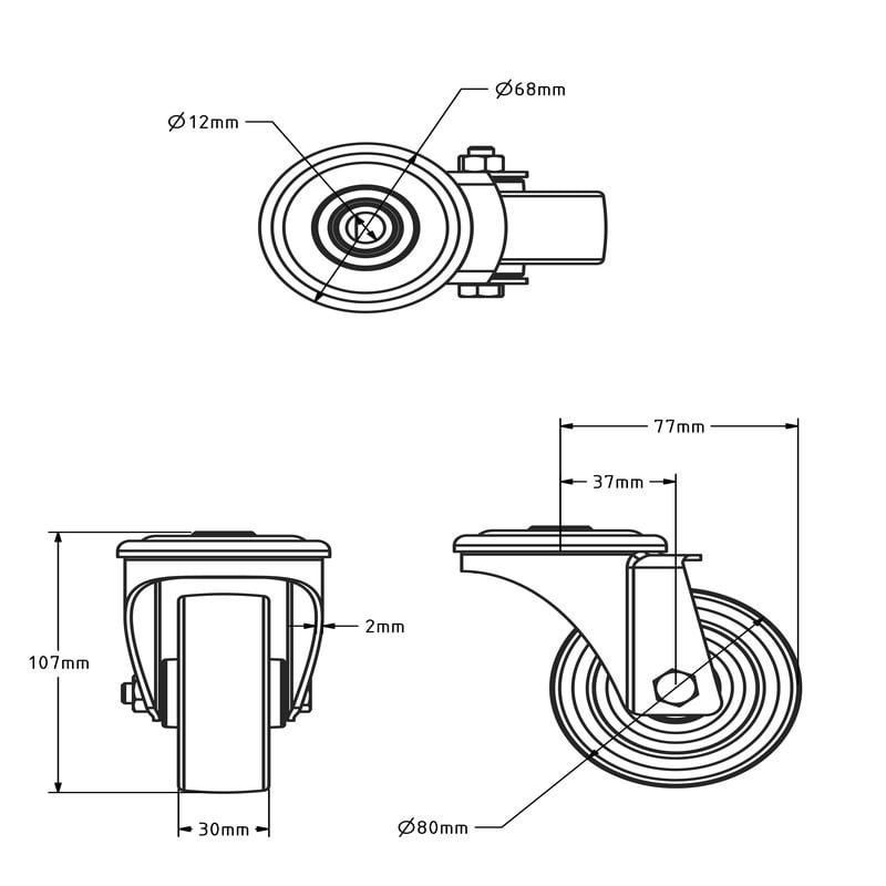 Kółko obrotowe ze stali nierdzewnej 80 mm PU z łożyskiem rolkowym ze stali nierdzewnej i mocowaniem z otworem na śrubę m12 - 120 kg