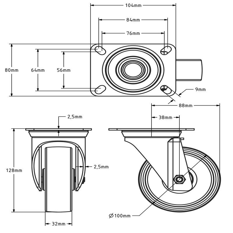 Kółko obrotowe PU 100 mm z mocowaniem płytkowym - 150 kg