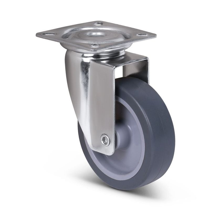 Kółka z szarąoponą gumową tpr (bez oznakowania), wtryskiwaną na plastikową obręcz z łożyskiem ślizgowym i tuleją osi ze stali nierdzewnej.