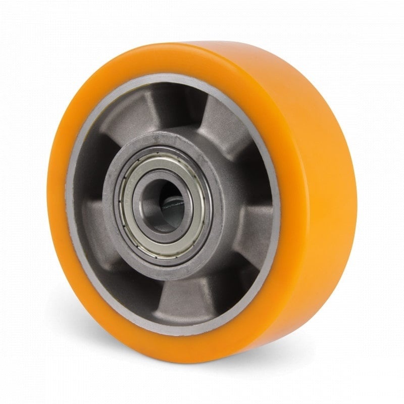 Kóła z oponą poliuretanową (ok. 92 Shore A), wulkanizowaną na aluminiowej obręczy z łożyskami kulkowymi.