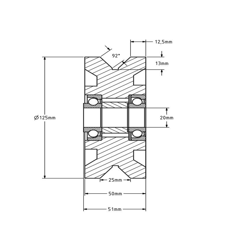 Łożyskowane koło rowkowe 125 mm stalowe z rowkiem V - 1000 kg (krążek linowy)
