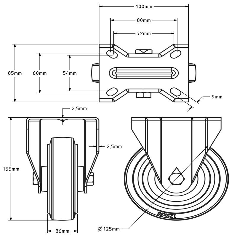 Kółko stałe ze stali nierdzewnej 125 mm - Elastyczna guma - 190 kg