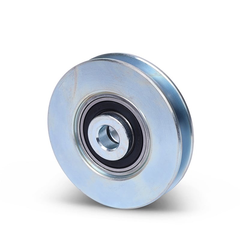 Krążek linowy wykonany ze stali (ocynkowany) z łożyskiem kulkowym.