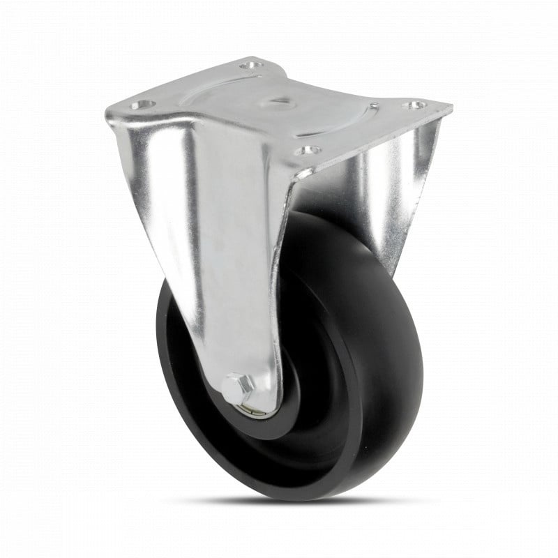 Wzmocnione widełki w połączeniu z poliamidowym kółem sprawdzają się w trudnych warunkach. Te wytrzymałe kółka stałe są idealne do wózków transportowych, które przewożą ciężkie towary i muszą wytrzymywać okazjonalne obciążenia udarowe i obciążenia szczytowe. Łącznik widełkowy jest starannie tłoczony i składa się z 5-milimetrowej płyty górnej oraz 4-milimetrowych nóżek łącznika widełkowego.