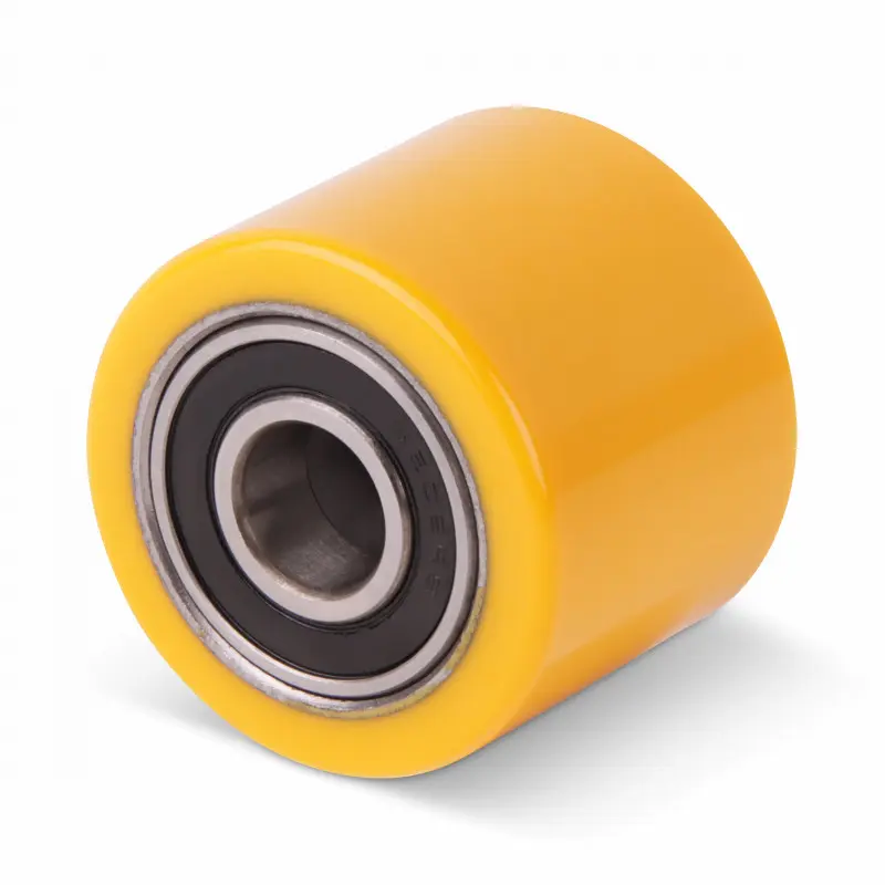 Rolki paletowe z taśmą poliuretanową (ca 92 Shore A), wulkanizowaną na stalowym rdzeniu z łożyskami kulkowymi.